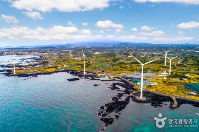 제주도 서쪽 끝을 따라 연결된 신창 풍차 해안도로는 해상풍력단지가 조성되어 있어 해안도로를 따라 줄지어 서 있는 풍차를 만날 수 있다. 구불구불 해안선을 따라 보이는 하얀 풍차와 에메랄드빛 바다는 우리에게 상쾌한 가을 풍경을 보여준다. (자료출처 : 대한민국 구석구석 - korean.visitkorea.or.kr)